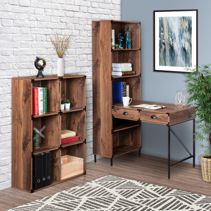 Create an appealing storage solution with a cool industrial vibe. This bookcase is composed of durable MDF wood, particle board and steel. Its five shelves provide great capacity for organizing and storing books, display objects and other items. The natural wood grain walnut finish brings a casual warmth and style to a living room, bedroom or home office.