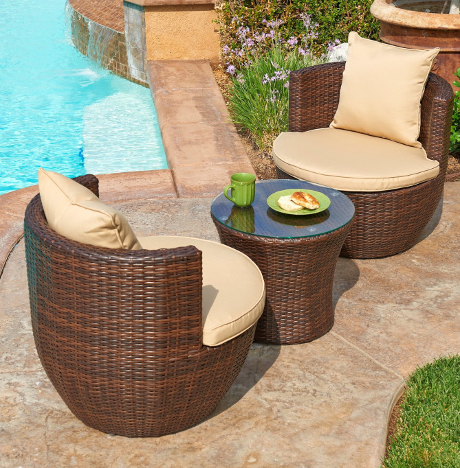 Create a cozy and intimate spot for two with the Perry 3-Piece Patio Set. This eclectic set features a duo of unique, cup-shaped chairs with irresistibly plush lower cushions and lumbar pillows. From the rust-resistant aluminum frame to the waterproof cushion fabric, this set is crafted to hold up beautifully to the outdoor elements.
