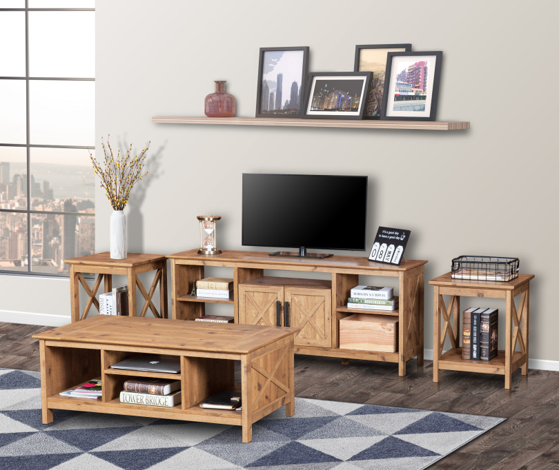 Spruce up a casual home entertainment space with this delightful TV stand, a charming piece styled with country inspiration. Enjoy the warm feel of a rustic brown finish with wood-knot look embellishments to create authenticity. An open-concept design yields four open-back shelves and an open space over a cabinet compartment that creates room for components on two shelved layers. Organize entertainment devices and accessories to craft a centralized space for keeping guests and family happy.