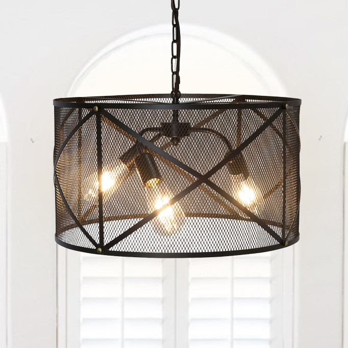 Three exposed bulbs rest within the metal mesh drum shade featured on this industrial pendant light design. Charming in an eat-in kitchen or in an entry, the pendant is accented with X-style framing laid over its mesh shade for added detail and depth.