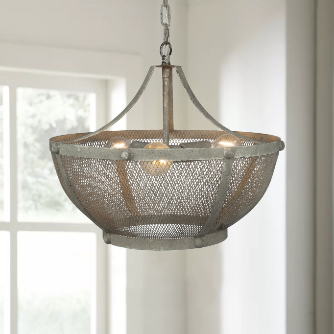 Turn full-on into a rustic or industrial motif with this three-light metal bowl pendant. Crafted in iron with a rustic finish that lends aged authenticity, the pendant boasts a metal mesh shade that harkens back to a simpler time. Six lights are LED compatible and deliver excellent lighting over a dining table, in an entry, or illuminating a sitting area.