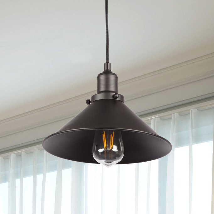 A wide canopy shade is the focal point of this industrial one-light pendant. A thoroughly charming choice over a breakfast nook in an urban loft, this pendant features metal construction with a rich black finish. A vintage-style light bulb is a perfect finishing touch.