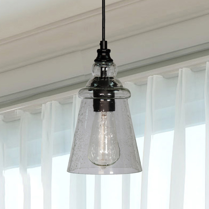Bring a fresh, elegant simplicity to a transitional décor space with this glass and black iron inverted mini-pendant. Bubble glass offers gorgeous texture to its ornate glass shade, while a bold black iron canopy and rod provide perfect contrast.