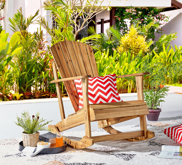 A gem from traditional outdoor entertaining, this acacia rocking Adirondack chair makes the case for extensive patio or poolside fun. Gardens, gazebos, and other outside venues welcome this stylish, nature-inspired chair built for comfort and good looks. With a gorgeous natural finish, its acacia wood construction features a slat chair back, straight arms, and a bonus rocking feature for an extra good seating experience. This Adirondack chair is fade- and weather-resistant, and folds up for easy storage between uses.