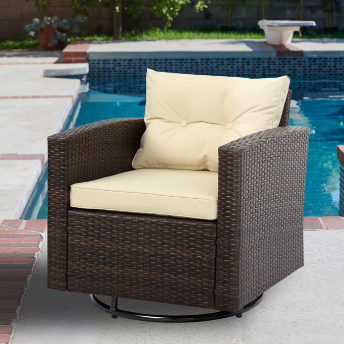 Relax in the shade or soak up some sun with this relaxing outdoor swivel chair. Perfect for a patio, the chair offers plush beige cushions that are water-resistant, and brown wicker that lends a refined, natural look. A swivel base adds to its relaxed ambiance while button tufting on the back cushion is a polished finishing touch.