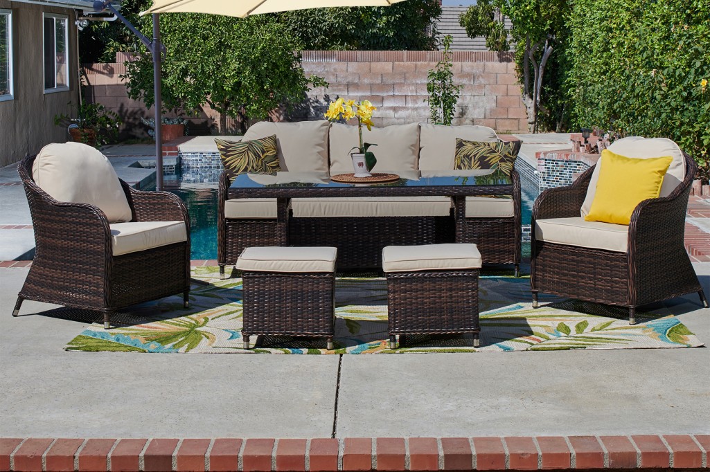 With its contemporary looks and flavor, the Bahia 4-Piece Patio Set makes an alluring addition to any outdoor living space. Couch and chairs feature exquisitely woven wicker with gently sloping curves and soft yet supportive cushioning. Seat cushions are designed to resist the elements and stay beautiful through years of use. Table has a tempered glass top with ample storage beneath.