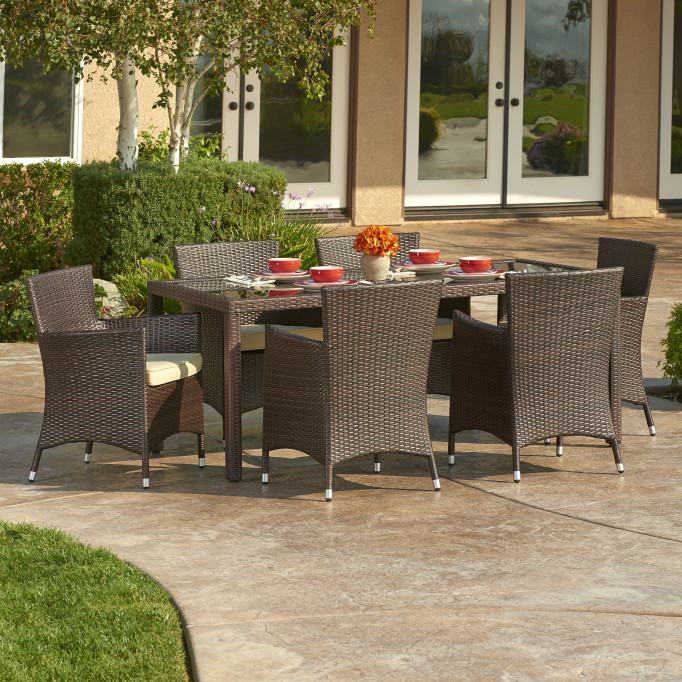 The Rica 7-Piece Patio all-weather wicker dining Set provides the perfect setting for both casual meals and elegant celebrations. Its six stationary chairs are enveloped in espresso-brown wicker and accented with gently sloping curves and soft, supple cushions. The beige cushion fabric contrasts beautifully against the dark weave and is designed to stay beautiful through years of use.