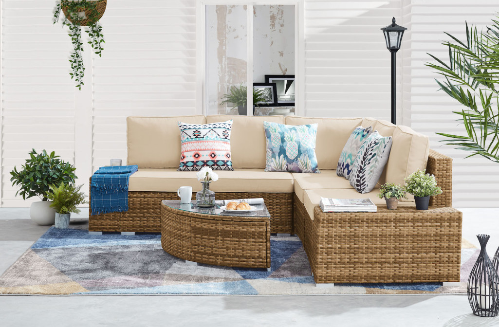6 Piece Outdoor Wicker Sectional Seating Set, Hazelnut/Beige
